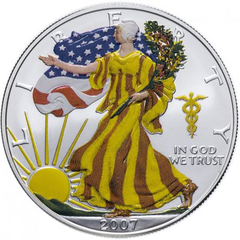 На реверсе цветное изображение Леди Свободы с букетом цветов и развевающимся позади флагом США. Внизу зелень. Справа надпись: IN GOD WE TRUST (В Бога веруем), вверху: LIBERTY (Свобода), внизу: 2007 (год чеканки). Изображение в цветах, символизирующих лето.