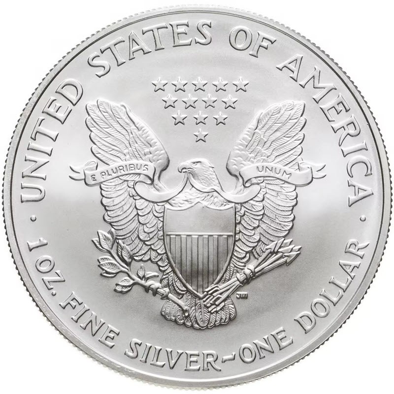 На аверсе изображен национальный символ США – белоголовый орлан, сжимающий в лапах 6 стрел и лавровую ветвь. Над орлом узор из тринадцати звезд, символизирующих тринадцать первоначальных штатов. Вдоль канта надпись: UNITED STATES OF AMERICA · 1oz FINE SILVER - ONE DOLLAR · (страна-эмитент, вес и проба серебра, номинал).
