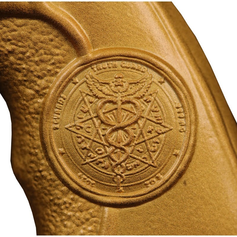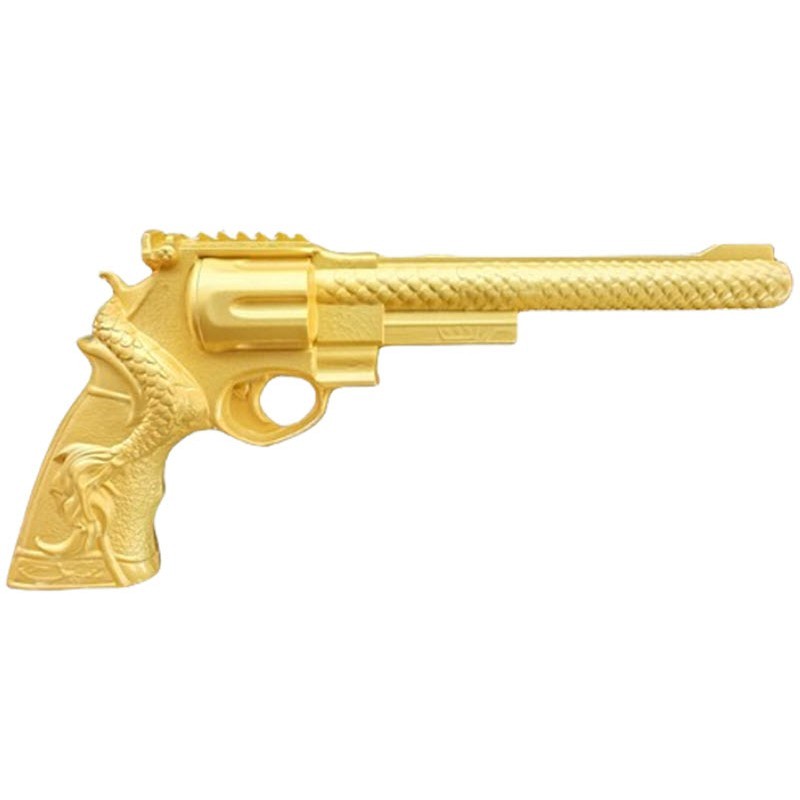 На реверсе изображен 3D револьвер с выборочным золочением. От рукояти к дульному срезу движется дракон, а ствол покрыт чешуей.