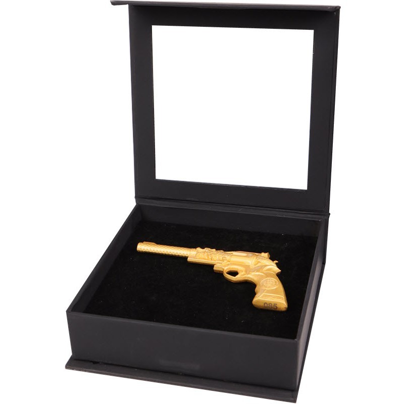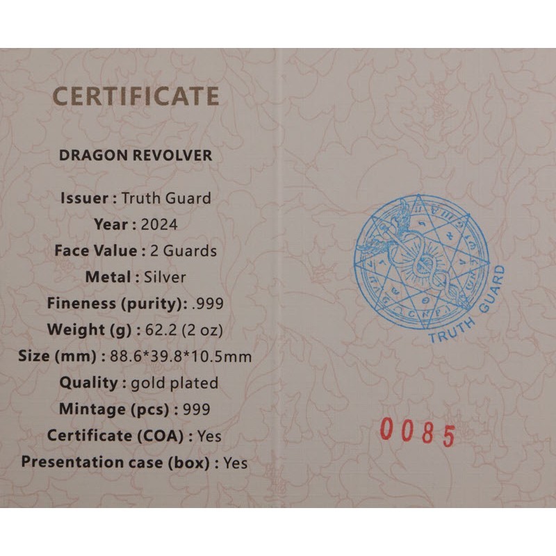 Эта удивительная серебряная монета весом 2 унции посвящена револьверу, украшенному драконом. У неё 3D-размер 88,6 Х 39,8 Х 10,5 мм и выборочное золочение.