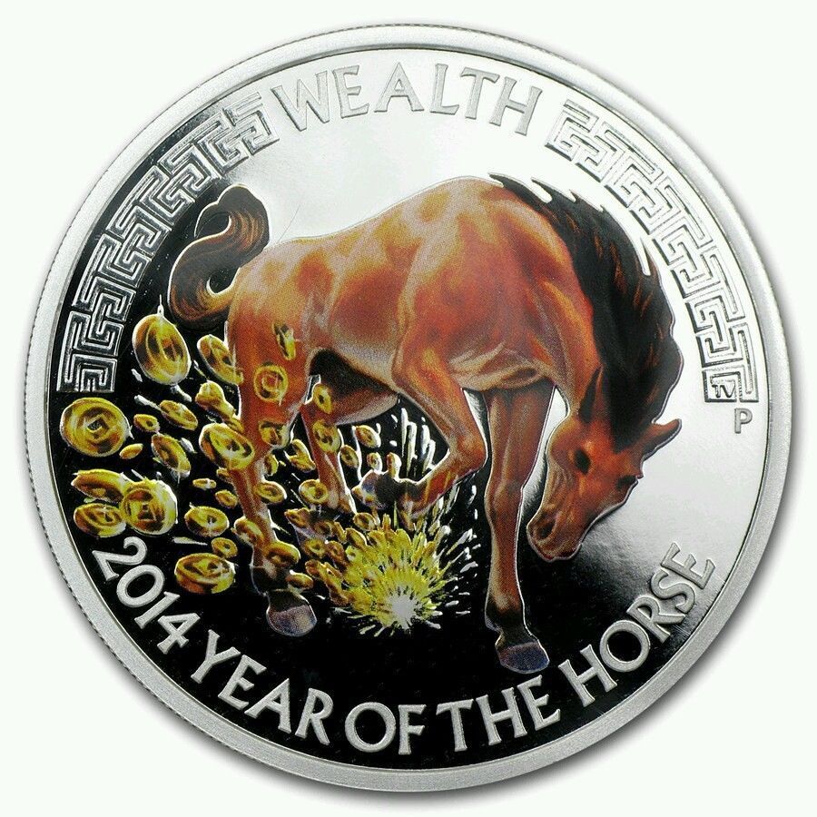 Цветное изображение лошади, выбивающей копытом золотые монеты. Вверху надпись WEALTH — богатство, внизу 2014 YEAR OF THE HORSE — 2014 Год Лошади