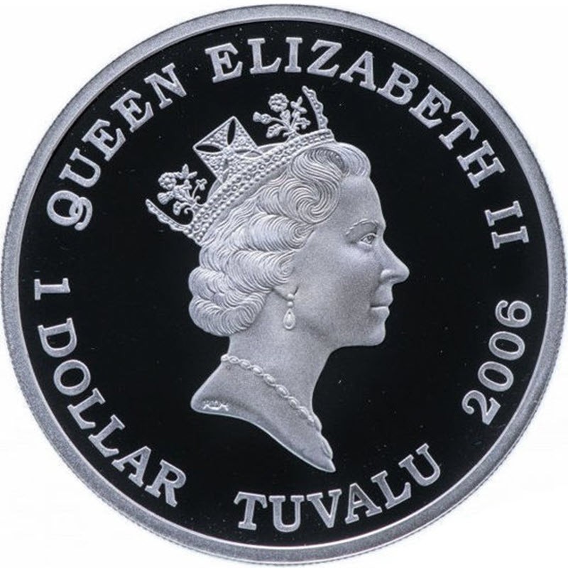 На аверсе изображена королева Елизаветы II с бриллиантовой диадемой и жемчужным ожерельем. На усечении шеи выгравированы инициалы дизайнера RDM (Raphael David Maklouf). Вдоль канта надпись: QUEEN ELIZABETH II 1 DOLLAR TUVALU 2006 (Елизавета II, номинал, страна-эмитент, год чеканки).