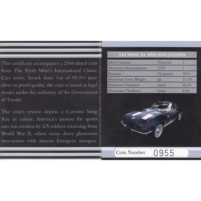 Серебряная монета Тувалу "Легендарные спорт-кары. Corvette Sting Ray" 2006 г.в., 31.1 г чистого серебра (проба 999)
