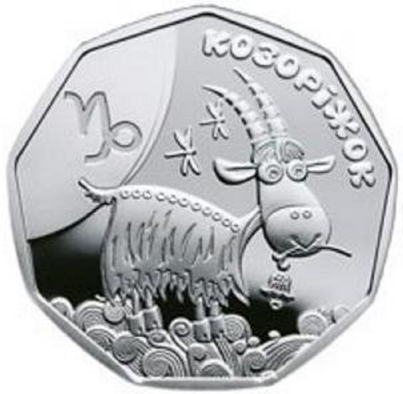 Реверс — символ знака зодиака Козерог, козленок посется на лужайке, надпись «КОЗОРІЖОК».