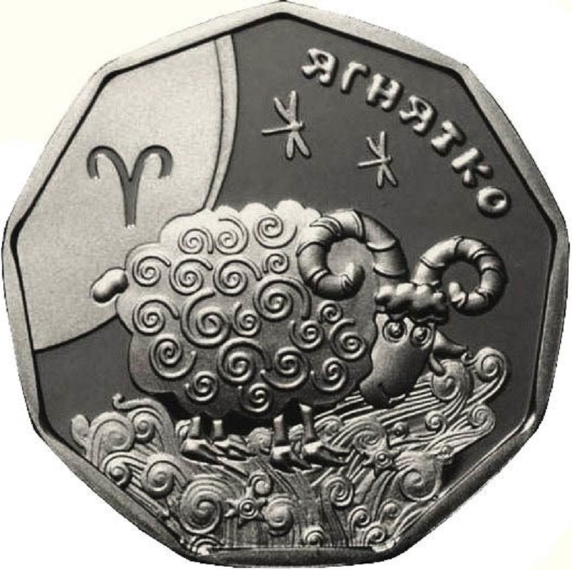 слева, на блестящей поверхности - знак Овна; в центре изображен маленький барашек на траве; выше надпись ЯГНЯТКО (ягненок).