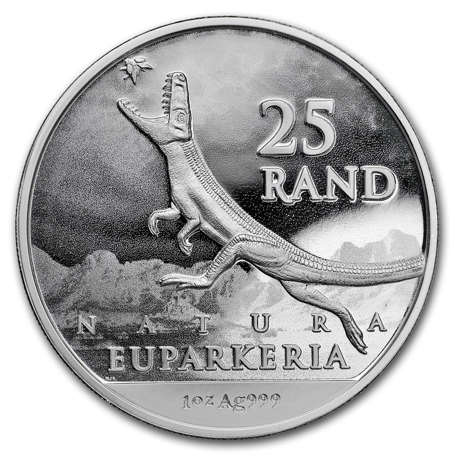 Изображение динозавра, прыгающего за насекомым. Номинал монеты — 25 ранд, внизу вес и чистота металла.