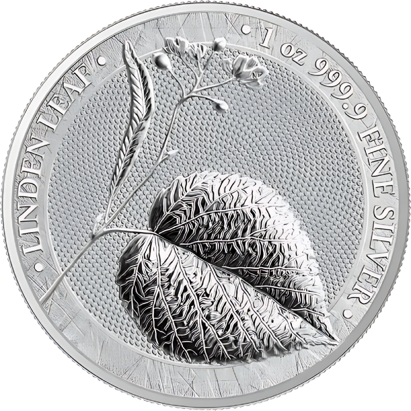 На аверсе изображён лист липы и её цветок. Слева надпись: LINDEN LEAF (Лист липы). Справа: 1 oz 999.9 ∙ FINE SILVER (вес и проба серебра)