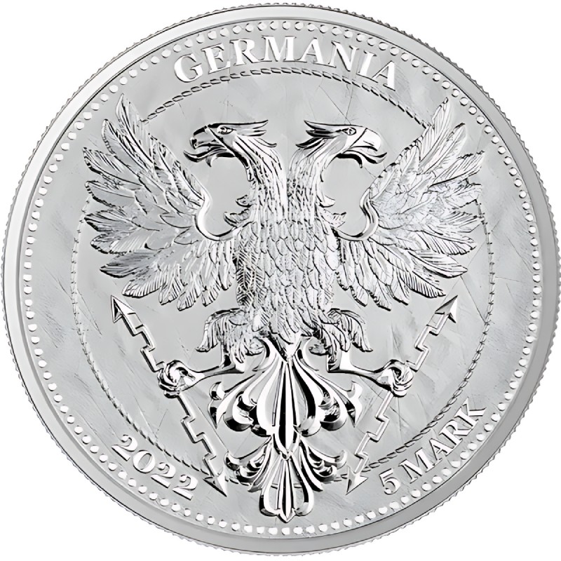 Реверс украшен двуглавым орлом, держащим в когтях молнии.  Вверху надпись: GERMANIA. Внизу: 2022 (год чеканки) 5 MARK (номинал).