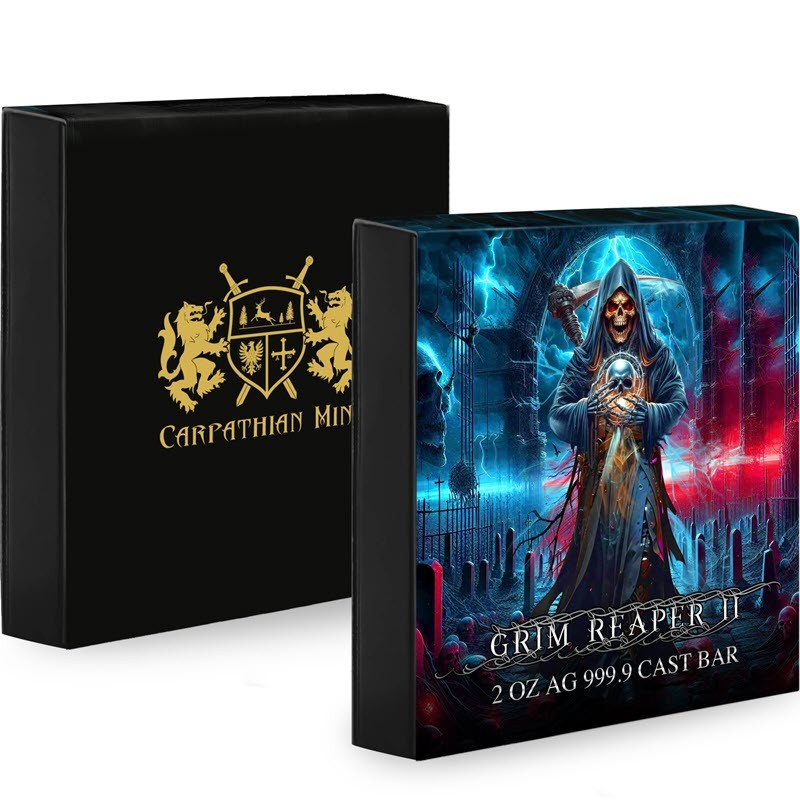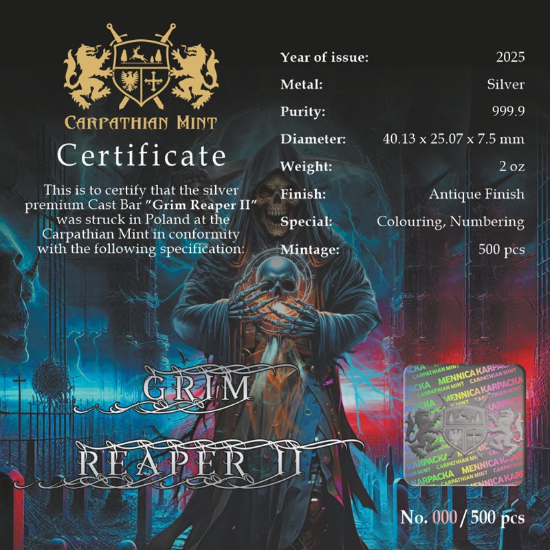 Этот серебряный жетон размером 40.13 x 25.07 x 7.5 мм от Carpathian Mint посвящен Жнецу. У него античное качество и селективная окраска. Поставляется в оригинальном футляре с сертификатом подлинности. Тираж: 500 штук.