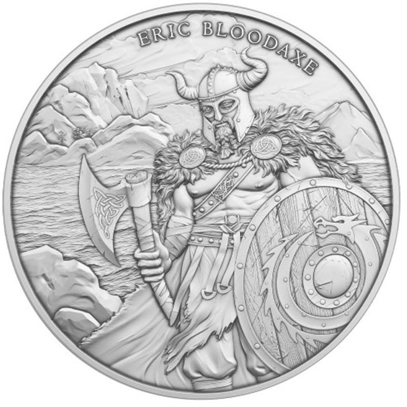 Первый жетон из серии "Legendary Warriors", посвященный Эрику Харальдссону, также известному как Эрик Кровавый Топор. В этой круглой серебряной монете весом в 1 унцию 999 пробы изображен знаменитый викинг, которому в сагах о викингах приписывается объединение Норвегии. Он наиболее известен как воин и король Норвегии, занявший свой трон в результате истребления своих братьев. Он также оставил видимые следы в виде монет, выпущенных на его имя в Йорке. И английские источники, и источники саг согласны с тем, что Эрик был убит в бою, хотя в более поздних английских хрониках такие подробности не появляются в современных источниках. Однако более поздние источники предполагают, что Эрик был убит в засаде Маккусом, сыном Олафа.