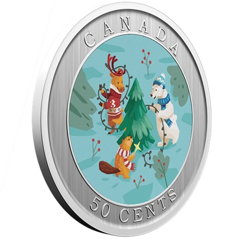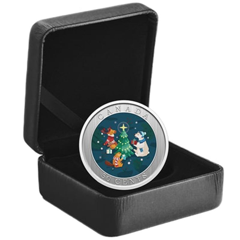 Эта чудесная монета из никелированной стали от Канадского монетного двора посвяшен украшению ёлки и обмену подарками. У нее качество BU, селективная окраска и лентикулярная технология, при наклоне монеты зимний пейзаж меняется с дневного на вечерний. Поставляется в оригинальном футляре с сертификатом подлинности. Тираж: 30000 штук.