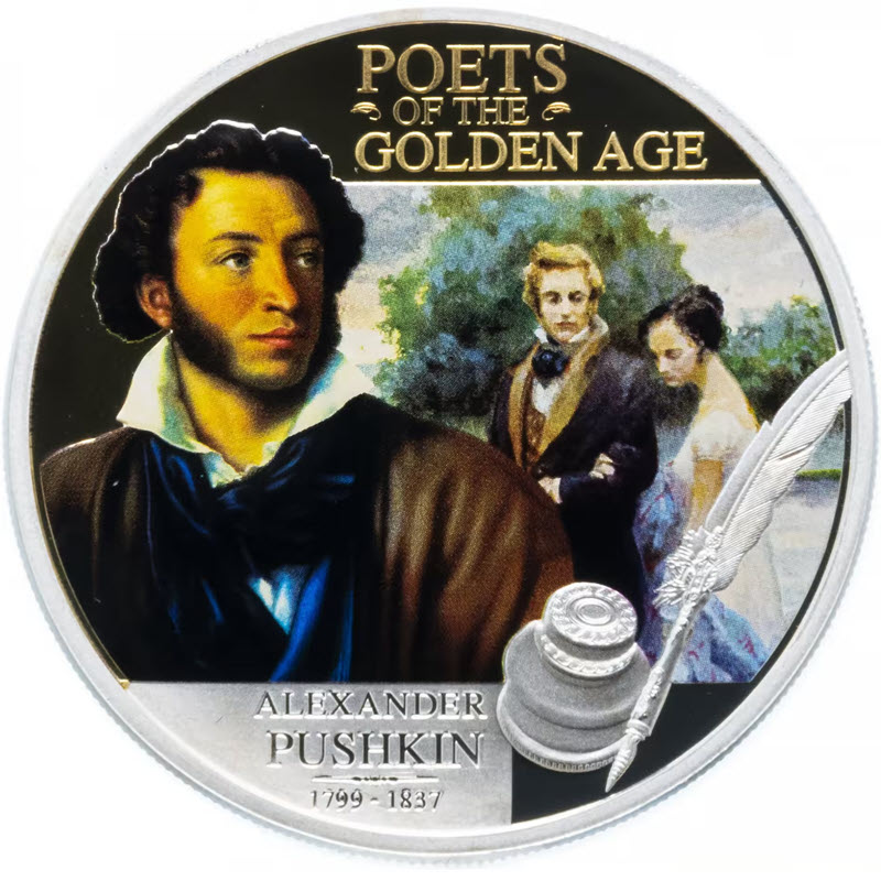 Серебряная монета серии «Поэты Золотого Века»,  посвященная Александру Сергеевичу Пушкину.