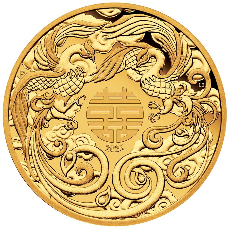 На реверсе в центре изображен символ двойного счастья: 囍 , под ним: 2025 (год чеканки). Вокруг символа два влюбленных Феникса на фоне стилизованных облаков. Слева монограмма Пертского монетного двора Р, справа инициалы дизайнера Лукаса Боуэрса (LB, Lucas Bowers).