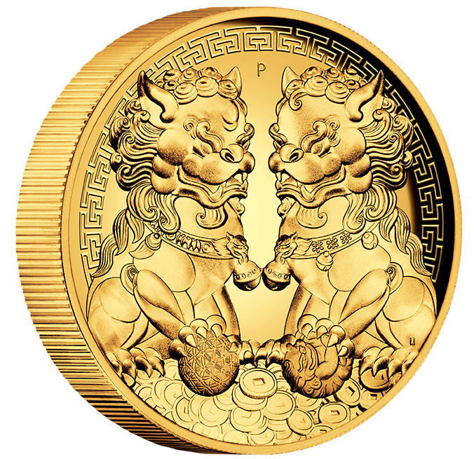Золотая монета с горельефом в 2 унции с изображением древнего китайского символа удачи, счастья и богатства - львов-хранителей (Двойной Пиксиу).