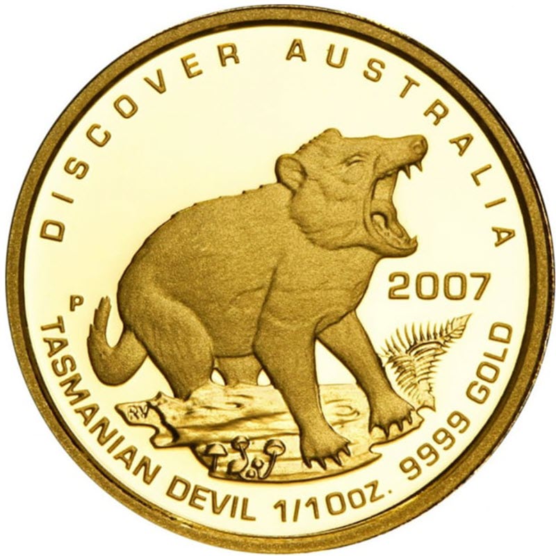 Золотая монета Австралии "Открой Австралию. Тасманийский дьявол" 2007 года выпуска. Серия "Открой Австралию" посвящена представителям фауны этой страны.