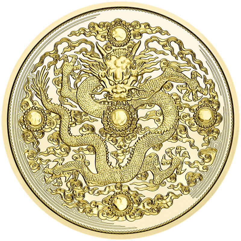 На реверсе изображена репродукция медальона с императорским драконом с пятью когтями в облаках периода Цяньлуна (1736–1795) из коллекции Музея прикладного искусства в Вене. Только на одежде императоров были изображены драконы с пятью когтями.