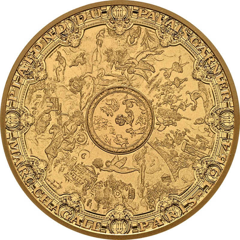 На реверсе изображена фреска Марка Шагала. Вдоль канта надпись: PLAFOND DU PALAIS GARNIER MARC CHAGALL PARIS – 1964 (Потолок Оперы Гарнье, художник, дата создания).
