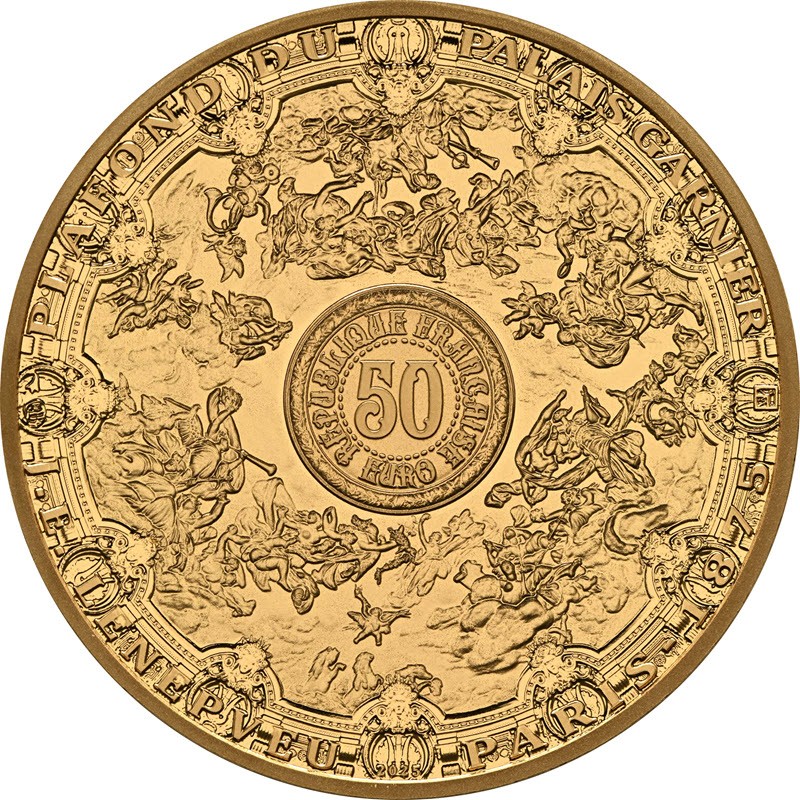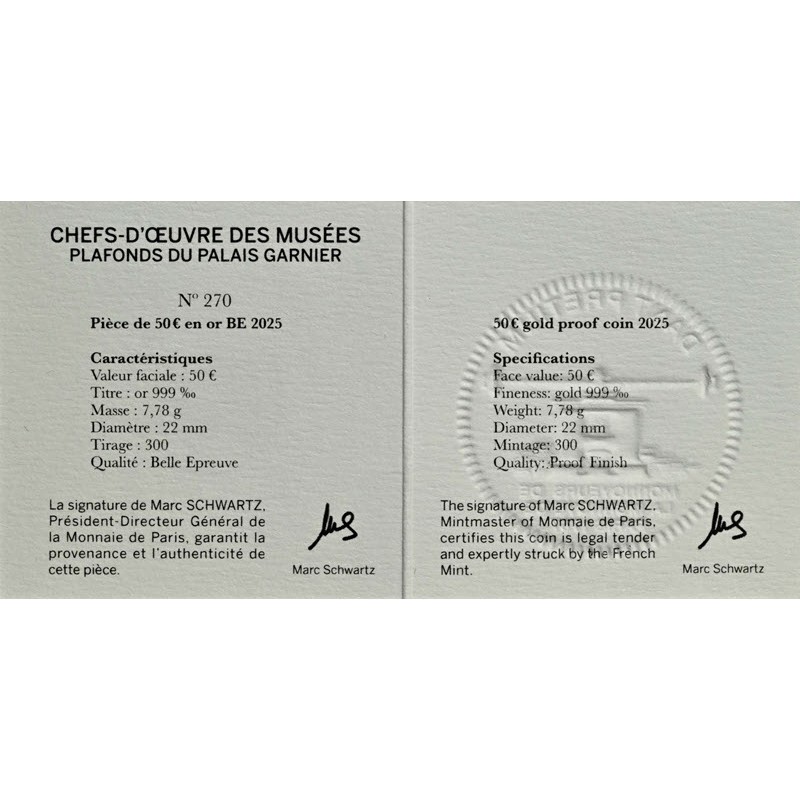 Золотая монета Франции 2025 года от монетного двора Monnaie de Paris «Потолки Оперы Гарнье» весом 1/4 унции посвящена Опере Гарнье. У нее качество пруф и высокий рельеф. Поставляется в оригинальном футляре с сертификатом подлинности. Тираж: 300 штук.