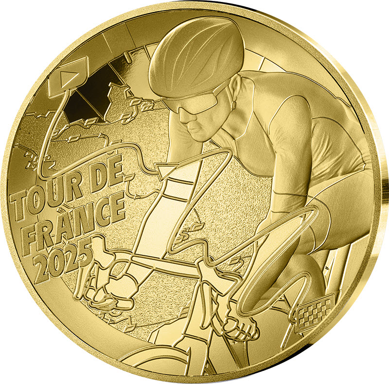 На аверсе изображены четыре фирменные майки Тур де Франс в виде геральдических эмблем: жёлтая майка лидера индивидуального общего зачёта, зелёная майка лидера очкового зачёта, майка в горошек лучшего горца и белая майка лидера молодёжного зачёта. Вверху надпись: TOUR DE FRANCE ™, ниже: RF 50€ (страна-эмитент, номинал). Внизу: 2025 (год чеканки) и монограммы Парижского монетного двора и дизайнера JJ (Joaquin Jimenez).