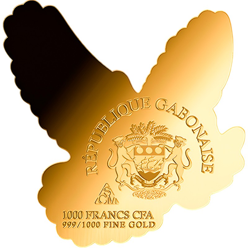 В центре - герб Республики Габон – щит с тремя безантами и корабль, с флагом на корме. Щит держат две пантеры, позади них - дерево, на корни которого они опираются. Над щитом надпись - RÉPUBLIQUE GABONAISE (страна-эмитент). Под гербом надписи: SCM 1000 FRANCS CFA 999/1000 FINE GOLD (монограмма немецкого монетного двора, номинал, проба золота).