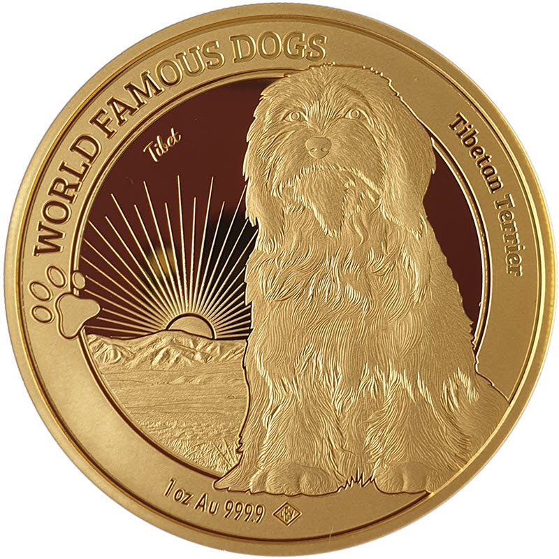 На реверсе изображен тибетский терьер, смотрящий на зрителя. Слева стилизованная собачья лапа. Над лапой надпись: Tibet (страна происхождения). Вдоль канта надпись: WORLD FAMOUS DOGS Tibetan Terrier 1 oz Au 999.9 (серия, тибетский терьер, вес и проба золота). Внизу: LEV (монограмма монетного двора).