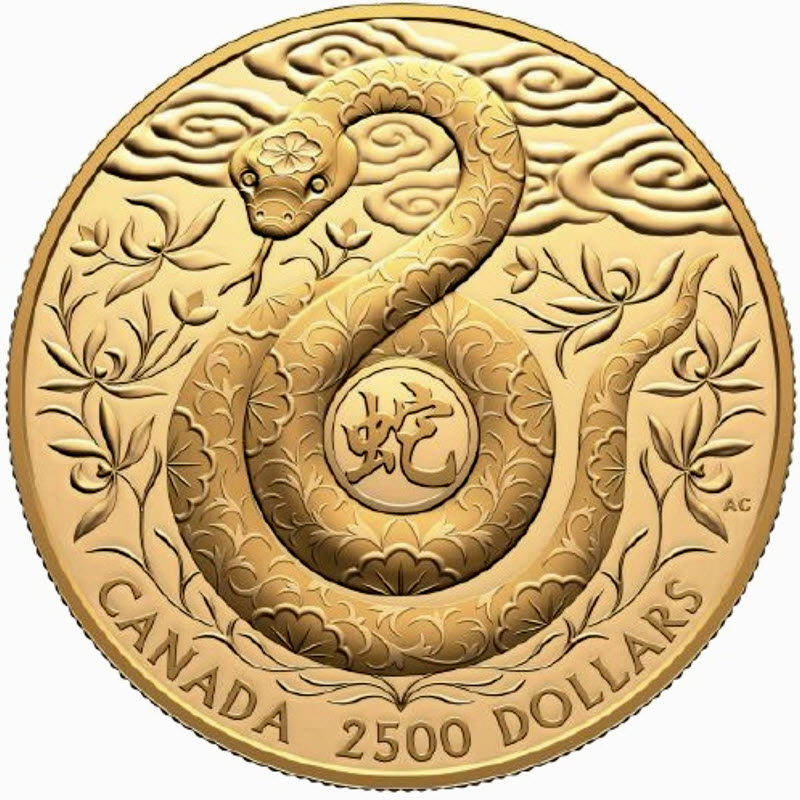 На реверсе изображена свернувшаяся змея на фоне стилизованных растений и облаков. В центре китайский иероглиф: 蛇 (Год Змеи), справа инициалы дизайнера AC (Aries Cheung), внизу вдоль канта надпись: CANADA 2500 DOLLARS (страна-эмитент, номинал).