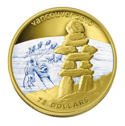 На реверсе изображен традиционный инкуншук – каменная фигура в культуре инуитов. На серебряной поверхности в центре слева изображены сани с запряженными собаками на снежной местности. Вверху по ободу в центре стоит надпись: «VANCOUVER 2010» (Ванкувер 2010). Снизу по ободу указан номинал: «75 DOLLARS» (75 канадских долларов).