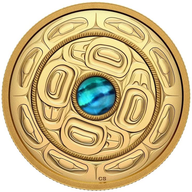 С его завихряющимися синими и зелеными цветами, которые напоминают цвета Тихого океана, центральная часть раковины морского ушка является органическим драгоценным камнем, который символизирует глубокую связь народа хайда с морем. Поскольку нет двух одинаковых раковин, каждая монета является поистине уникальным предметом коллекционирования.