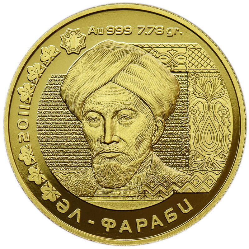 На реверсе монеты в центральной части изображен фрагмент лицевой стороны банкноты достоинством 1 тенге, на которой размещен портрет великого мыслителя Востока Аль-Фараби. По окружности надпись «ӘЛ-ФАРАБИ» на государственном языке, число «2011» обозначающее год чеканки и графические элементы с банкноты. В верхней части надпись «Au 999 7,78 gr.» обозначающая металл, из которого изготовлена монета, его пробу и массу. По окружности выступающий кант.