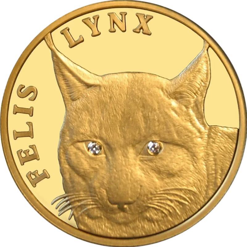 На монете изображена голова рыси со вставками из двух бриллиантов в виде глаз, а также надпись «FELIS LYNX» - зоологическое название вида.