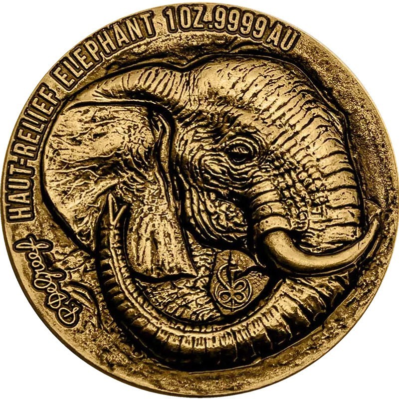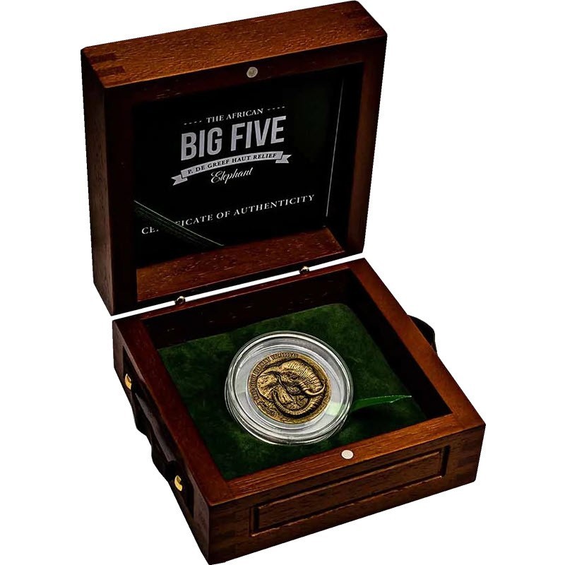 Эта удивительная золотая монета из серии «Большая пятерка Африки» весом 1 унция посвящена слону, самому большому наземному животному в мире. Потрясающий ультравысокий рельеф с античной отделкой работы Бени Дебакера (Beni Debacker). Дизайн был реализован медальерами монетного двора П. де Грефа на высочайшем уровне, даже такие тонкости, как морщины, впечатляюще смотрятся. Монета в оригинальном футляре с сертификатом подлинности. Тираж: 199 штук.