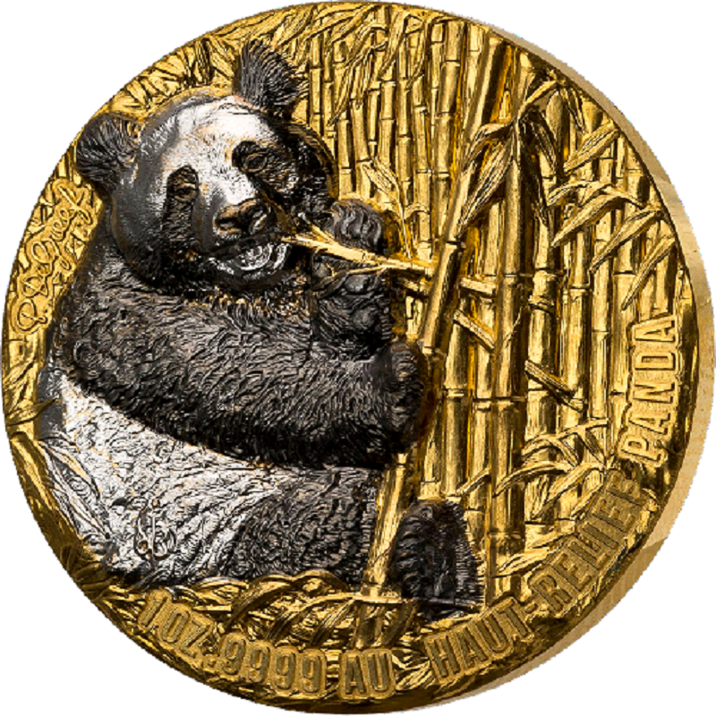 На реверсе монеты изображен крупный план великолепной панды. Панда стоит на бамбуковом дереве и имеет подробный горельеф. Эта красивая золотая монета также включает цветные аппликации из белого и черного родия, что делает ее единственной в своем роде. По всему реверсу надписи: «HAUT-RELIEF» — что означает высокий рельеф, и «1 OZ .999 AU» — вес монеты и проба золота.