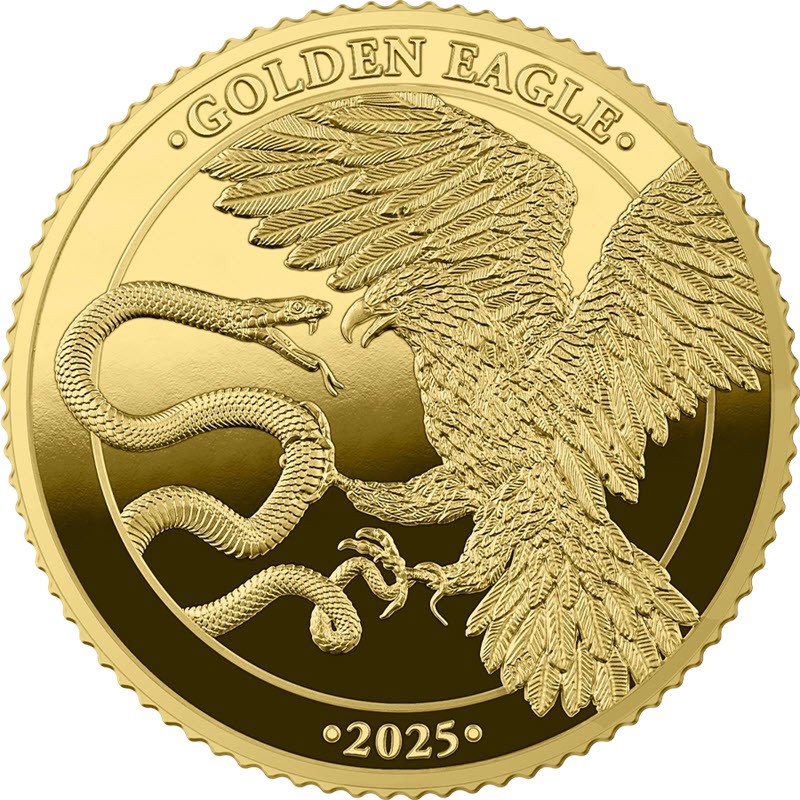 На реверсе изображена битва мощного Орла с опасным и злобным Змием на фоне стилизованных морских вод Средиземноморья. Вверху вдоль канта надпись: • GOLDEN EAGLE • , внизу: • 2025 • (год чеканки).