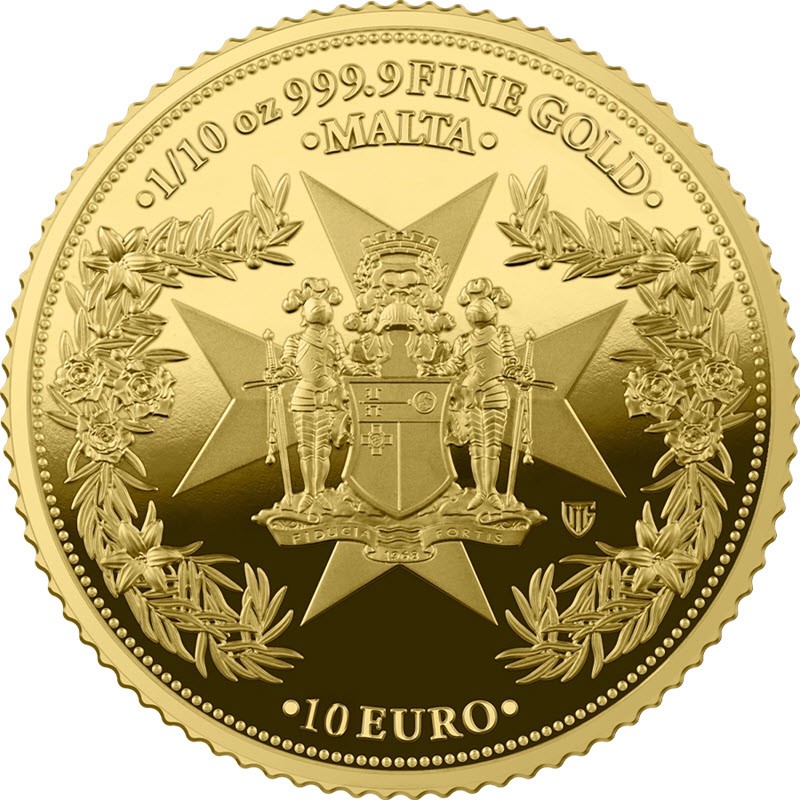 На аверсе изображен герб Центрального банка Мальты. Внизу герба на ленте надпись: FIDUCIA FORTIS 1968. Справа от герба монограмма монетного двора Германии (GM Germania Mint). Герб окружен оливковыми и пальмовыми ветвями, символами мира. Цветки лилии символизируют величие и славу, а розы – атрибут чистоты и гармонии. Вверху вдоль канта надпись: • 1/10 oz 999.9 FINE GOLD • (вес и проба золота), ниже: • MALTA • (страна-эмитент). Внизу: • 10 EURO • (номинал).