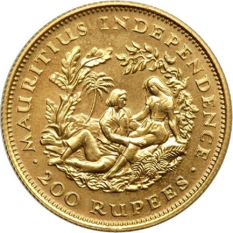 Изображение Адама и Евы в райском саду. Надпись — MAURITIUS INDEPENDENCE и номинал — 200 RUPEES