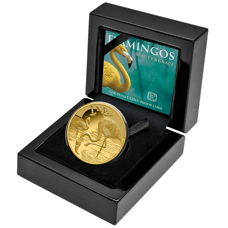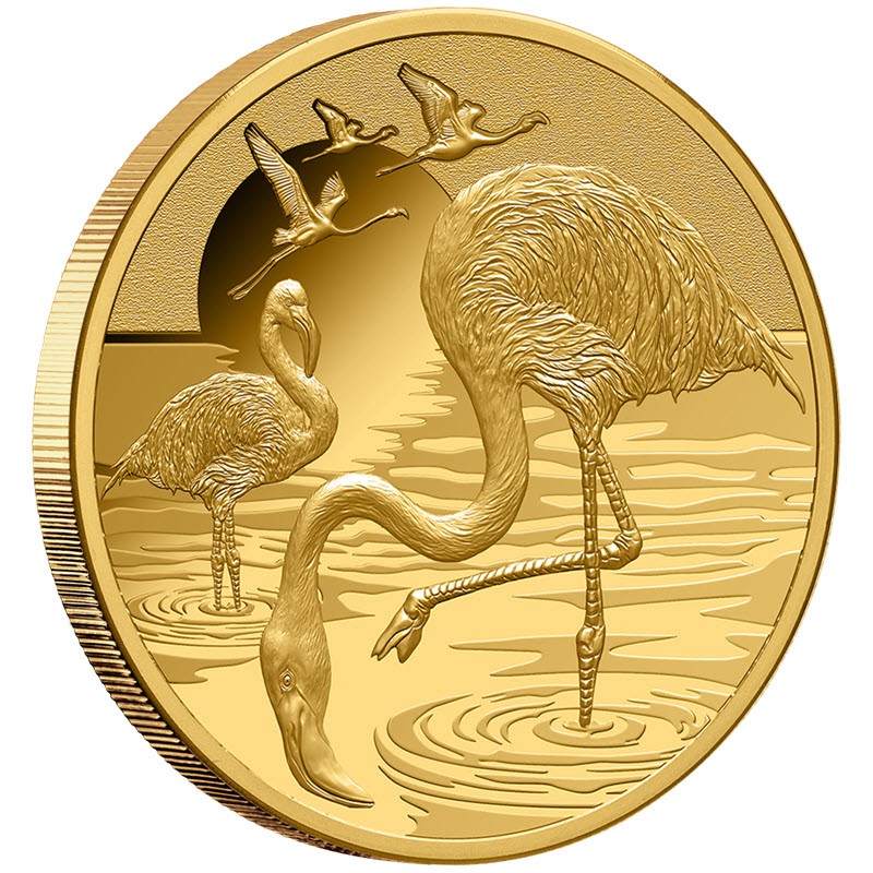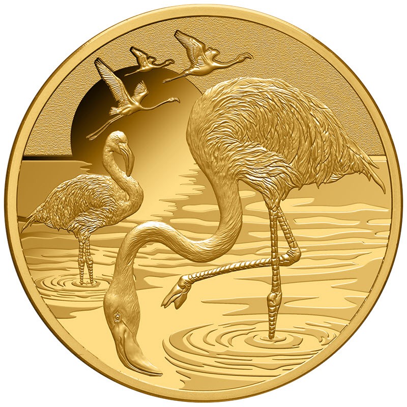Эта чудесная золотая монета весом в 1 унцию посвящена фламинго. У нее прекрасный дизайн и качество пруф. Поставляется в оригинальном футляре с сертификатом подлинности. Тираж: 50 штук.