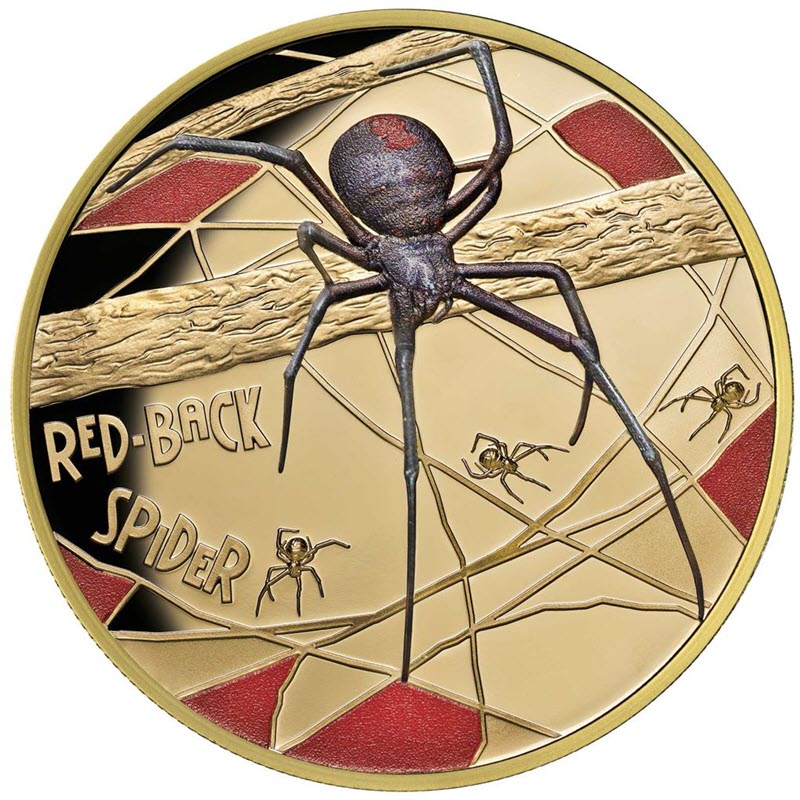 На реверсе пугающе реалистичное красочное изображение Красноспинного паука. Слева надпись: RED-BACK SPIDER.