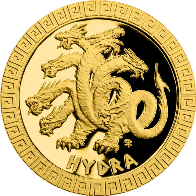 На реверсе монеты изображено прекрасное изображение угрожающей семиглавой Гидры, змеевидного водного монстра в греческой и римской мифологии. Внизу реверса надпись: "HYDRA" - название монеты.
