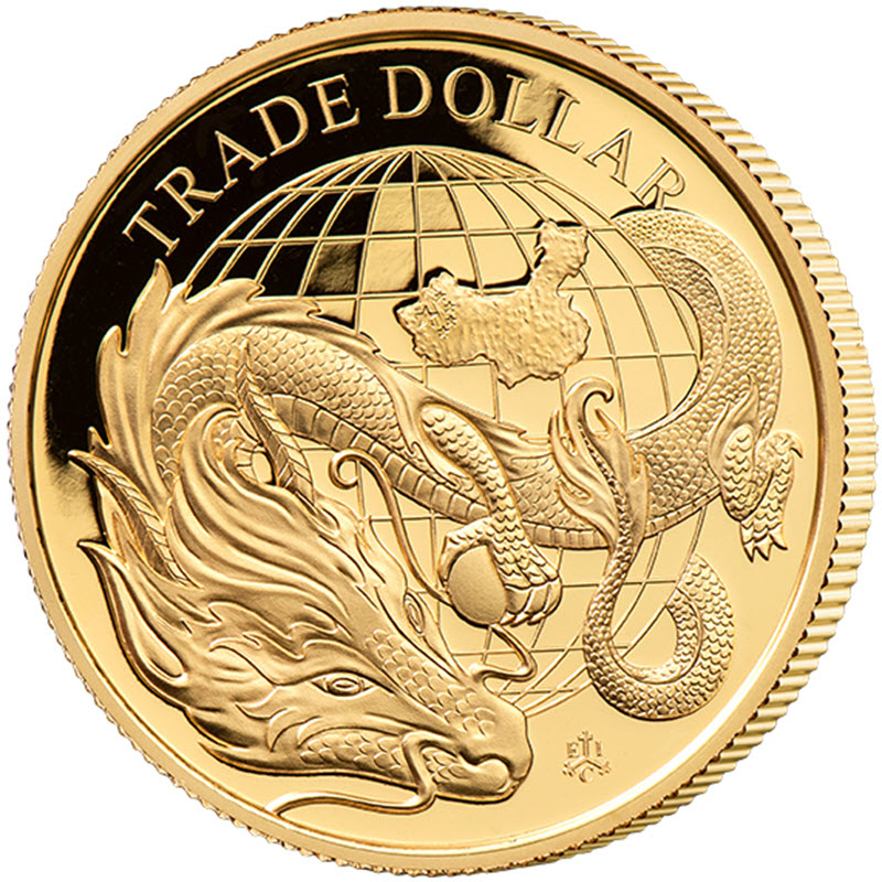 На реверсе изображен могучий дракон, обвивающий земной шар с картой Китая. Вверху надпись: TRADE DOLLAR, внизу: EIC (монограмма монетного двора Ост-Индской компании).