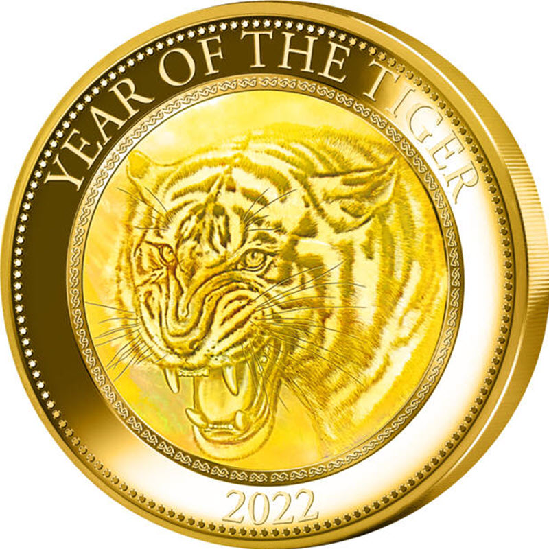 Золотая монета весом в 5 унций посвящена тем, кто родился в китайский лунный год Тигра. Тигры, считающиеся храбрыми, сильными и устрашающими, являются символом власти и господства в китайской культуре и 3-м животным в 12-летнем цикле зодиака. Люди, рожденные в год Тигра, предприимчивы и амбициозны. Монета имеет вставку из перламутра, качество Proof и поставляется в элегантном футляре вместе с сертификатом подлинности.