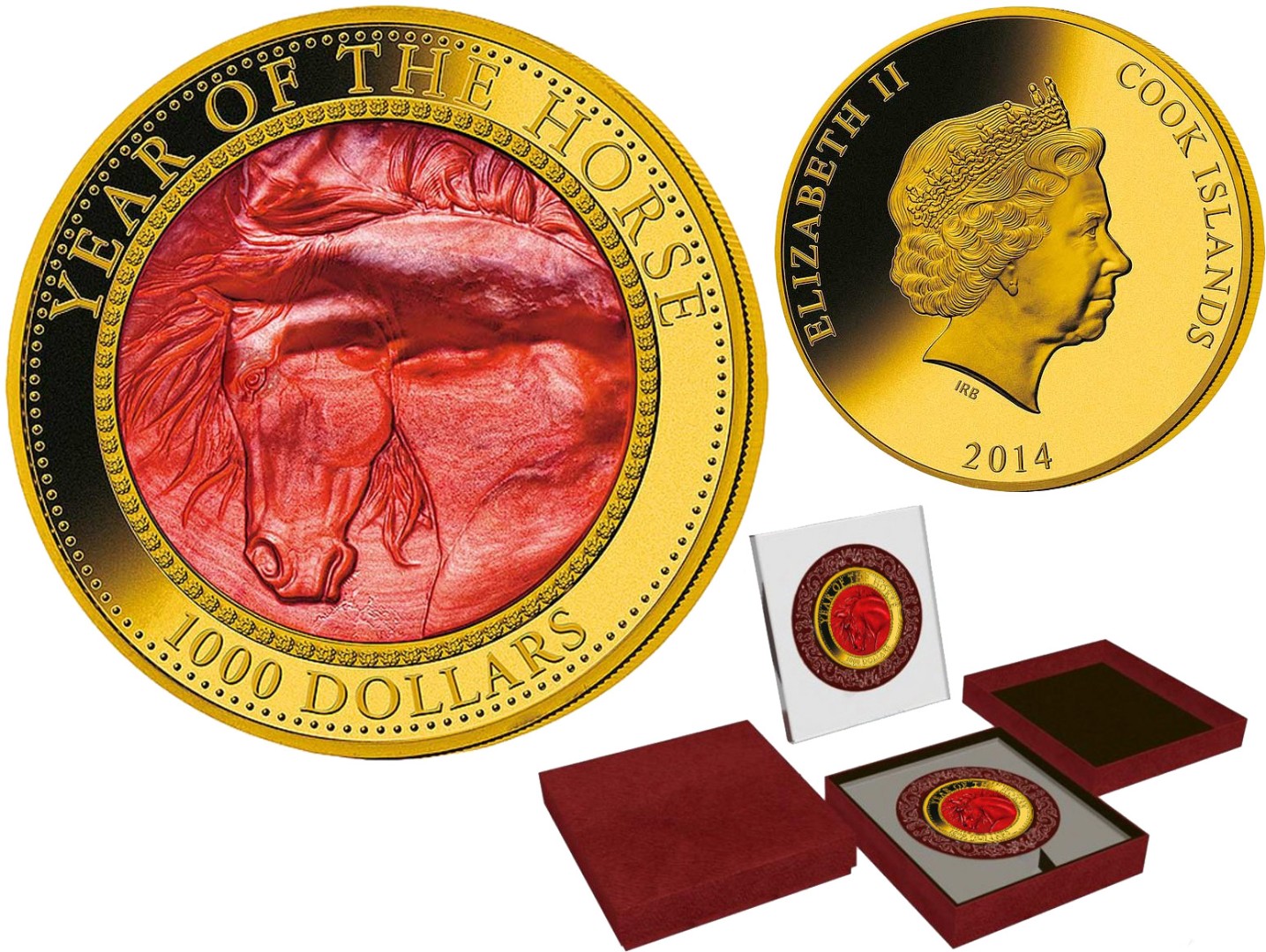 Изображение лошади, выполненное из красного перламутра. По ободу надпись — «Year of Horse» и номинал монеты.