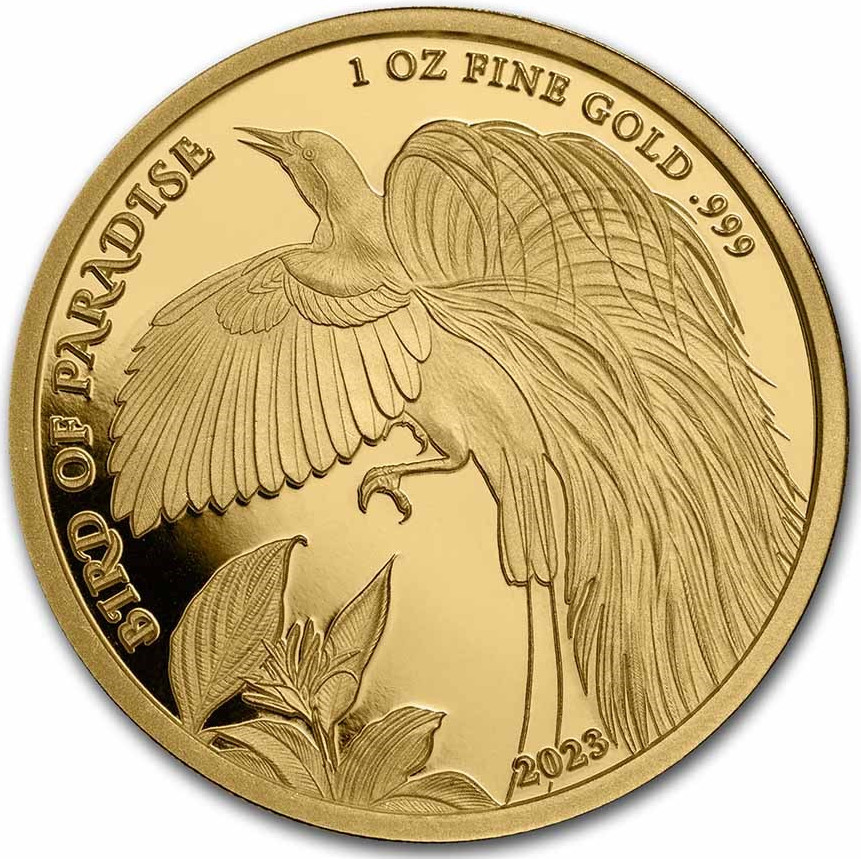 На реверсе изображена летящая райская птица. Слева надпись: BIRD OF PARADISE. Вверху вес и чистота металла: 1 OZ FINE GOLD .999. Внизу год выпуска - 2023