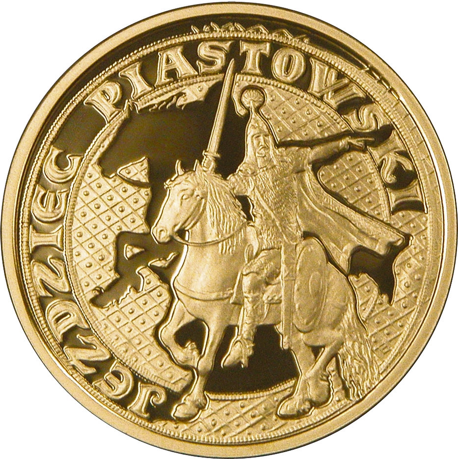 В центре стилизованное изображение конного сержанта в доспехах с обнаженной саблей. На заднем плане тень сержанта. Слева полукругом надпись: JEŹDZIEC PIASTOWSKI (Пястский всадник).