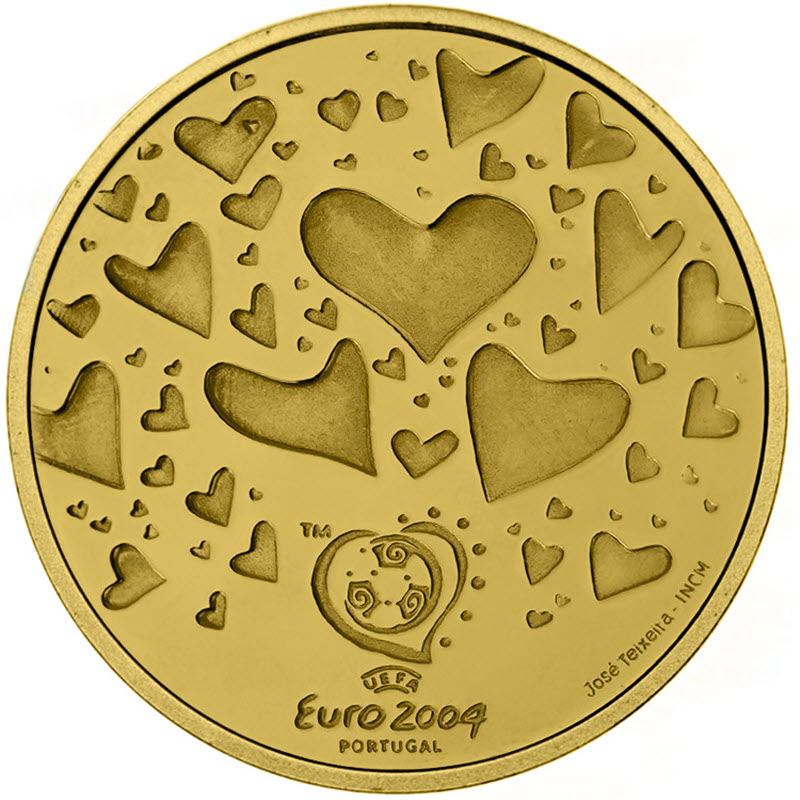 Поле монеты заполнено сердцами, снизу надпись Euro 2004 PORTUGAL