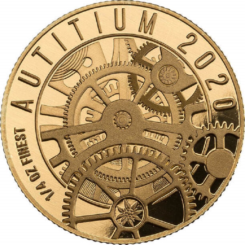 На реверсе монеты изображено красивое изображение шестеренок, которые, кажется, подходят друг другу. На реверсе надписи: «AUTITIUM» - название монеты, «2020» - год выпуска и «1/4 OZ FINEST» - вес монеты и проба двух металлов.