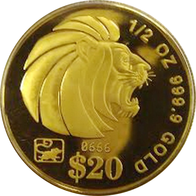 На аверсе изображена голова рычащего льва. Справа от нее по канту надписи: «1/2 OZ 999.9 GOLD $ 50» (вес чистого золота в монете – ½ унции, чистота золота – 999,9; номинал – 50$ сингапурских долларов).