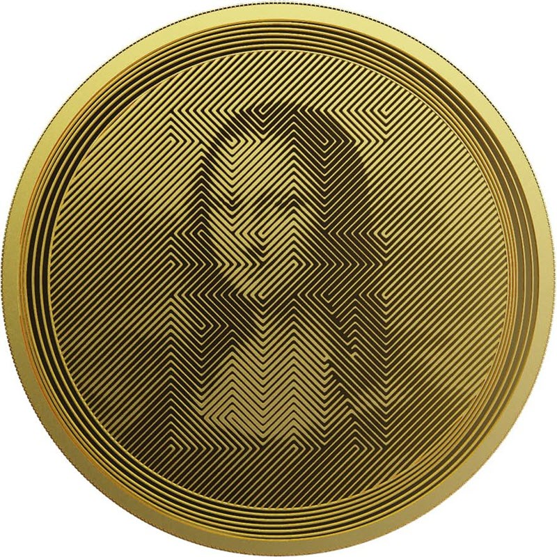 На реверсе изображение текстурированной поверхности, напоминающий эффект муара. Они отображают скрытое изображение Мона Лизы, с наложением слова ICON.