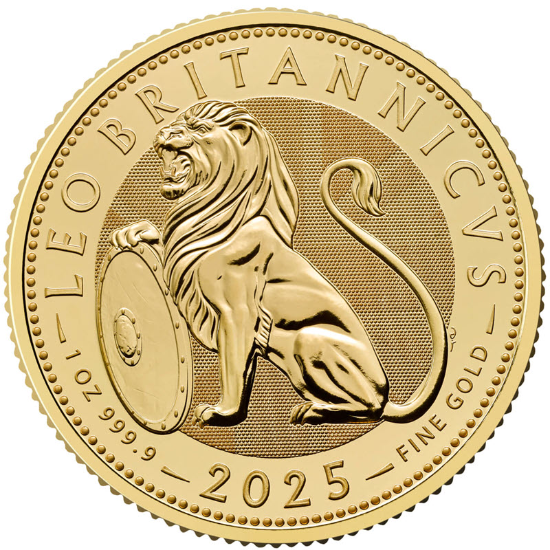 На реверсе изображен лев со щитом на фоне анимации флага Великобритании. Справа у хвоста инициалы дизайнера DL (David Lawrence). Вдоль канта надпись: LEO BRITANICVS 1 OZ 999.9 - 2025 - FINE GOLD (Британский лев, вес и проба золота, год чеканки).