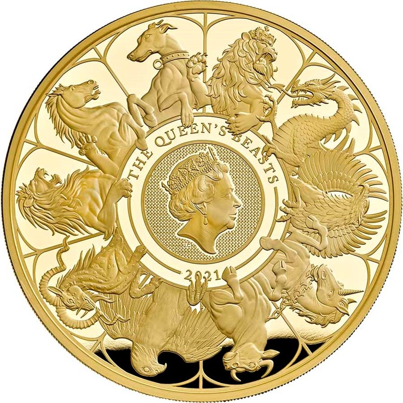 Реверс разработан Джоди Кларком, на нем изображены все десять грозных королевских стражей, вокруг портрета Елизаветы II. Вокруг портрета по кругу надписи — название серии «Queen's Beasts», вес и чистота металла, а также, год выпуска — 2021