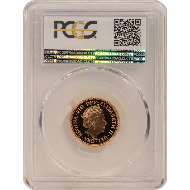 На реверсе классическое изображение Святого Георгия и дракона от Бенедетто Пиструччи. Внизу справа инициалы дизайнера Бенедетто Пиструччи: B.P. (Benedetto Pistrucci), по центру: 2017 (год чеканки).